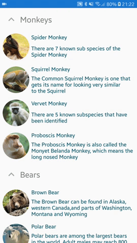 XFExpandableListView An Implementation of Expandable ListView Control in Xamarin.Forms. Documentation TODOs -Add Documentation and usage Notes The images are from: http://bearwithus.org https://www.monkeyworlds.com