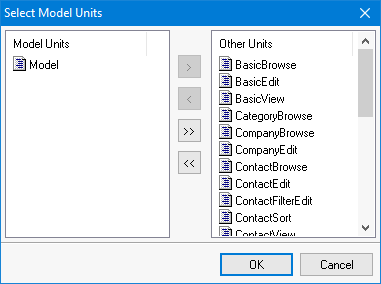 The Select Units button will open a dialog showing all the units of the current project. The left side of the dialog shows the model units and the right side shows the other units included in the project. Use the buttons between the two lists to move one or more units from one side to the other.  Select the OK or Cancel button to close the dialog and save or cancel, respectively, any changes. When the model unit(s) has been declared the business model can be created or maintained using the treeview pane's right button click, pop-up menu.