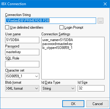 Defining a Broker Connection The first step in preparing the database is to define a connector using a specific broker to establish a connection to the database. Click the right mouse button over the Connection Manager dialog and select New in the pop-up context menu. Choose the preferred Broker and its ConnectionDef Editor appears. The contents of the ConnectionDefEditor varies depending on the requirements of its related broker. The example image below is for the Interbase/Firebird IBX broker.