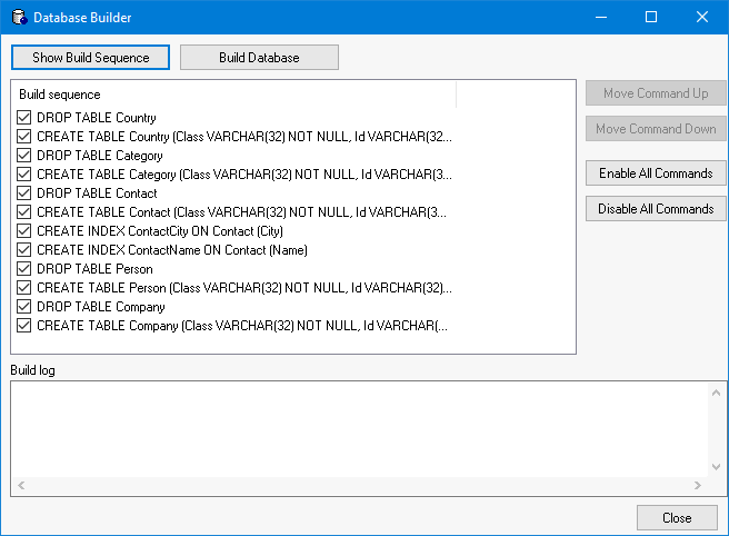 Building the Database for a Model WARNING: Any existing data in the database will be destroyed during the build process! Select the desired Broker Connection in the Connection Manager then to Build its database click the Build button. The Database Builder dialog appears. Click on the Show Build Sequence button and the Evolution Sequence pane will display the sequence of commands that will be executed during the actual build process. The individual steps can be disabled, enabled and re-ordered as desired using the check boxes on the left of each step in the sequence and the buttons on the right of the dialog. When the desired sequence is ready, click the Build Database button to execute it. The build progress and results are reported in the Evolution Log pane.