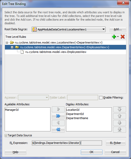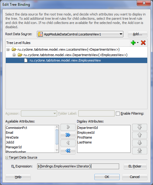A small Oracle ADF example of a tree filtering a table and selecting its row. Model is based on on standard Oracle HR. The example is exposing this hierarchy: