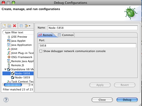 Eclipse debugger plugin for V8 can be easily used to debug node scripts. (On OSX 10.5 the plugin requires an Eclipse 64 bit Version, started with Java SE 6). The V8 engine provides debugging support by enabling attachment of the remote debugger on a TCP port (5858 is node’s default). There are 2 debug related node options: