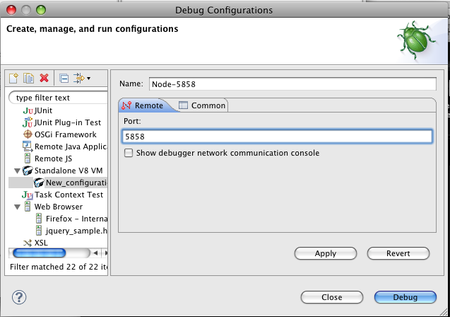 Eclipse debugger plugin for V8 can be easily used to debug node scripts. (On OSX 10.5 the plugin requires an Eclipse 64 bit Version, started with Java SE 6). The V8 engine provides debugging support by enabling attachment of the remote debugger on a TCP port (5858 is node’s default). There are 2 debug related node options: