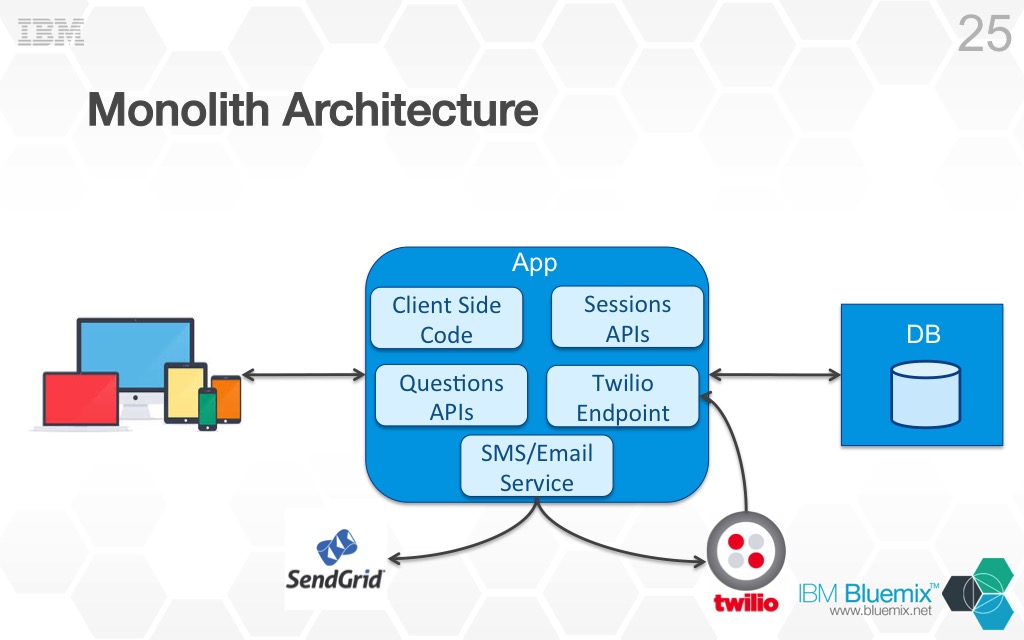 如你所见,单一应用(中间的蓝色方块)包含了很多组件。它包含了服务于浏览器的客户端代码、客户端代码所使用的 REST APIs、Twilio(文字输入)的 REST API 以及用于发送邮件或文本答案的代码。所有关于演讲和在提问的细节都存储在一个数据库中。就像我所说的,一个非常传统的应用结构,已经部署在云服务上,没有任何问题。