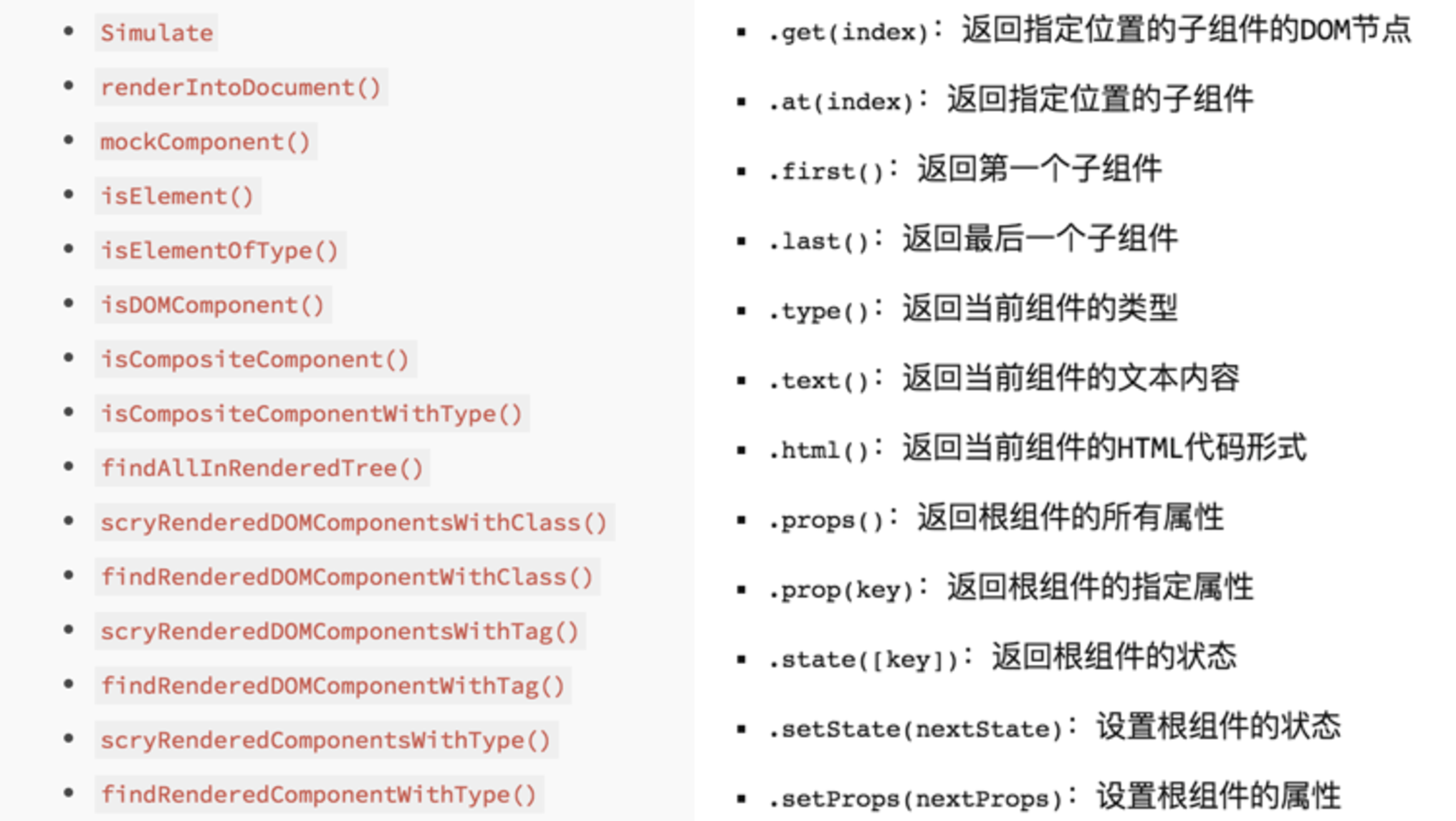 })render 方法则会将 React 组件渲染成静态的 HTML 字符串,返回的是一个 Cheerio 实例对象,采用的是一个第三方的 HTML 解析库 Cheerio,官方的解释是「我们相信 Cheerio 可以非常好地处理 HTML 的解析和遍历,再重复造轮子只能算是一种损失」。这个 CheerioWrapper 可以用于分析最终结果的 HTML 代码结构,它的 API 跟 shallow 和 mount 方法的 API 都保持基本一致。