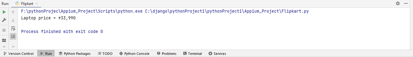 Description : Hear we are testing the flipkart app via Appium with Python and we are getting the laptop price in the console window