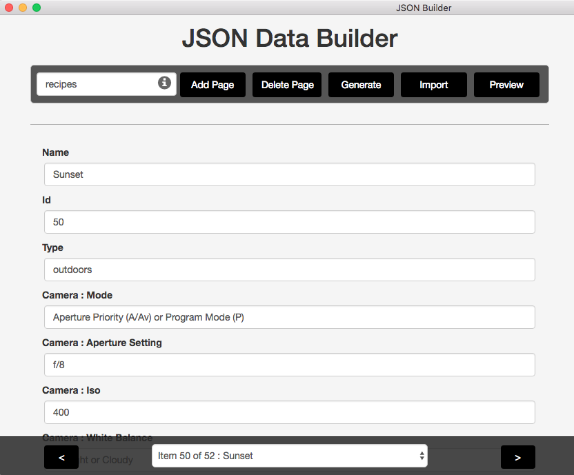 Visually create, explore or modify JSON payloads. This tool provides a way to safely change a particular value within a saved JSON file without needing a text editor. Used to quickly iterate on some content within this book (from which examples below are taken).