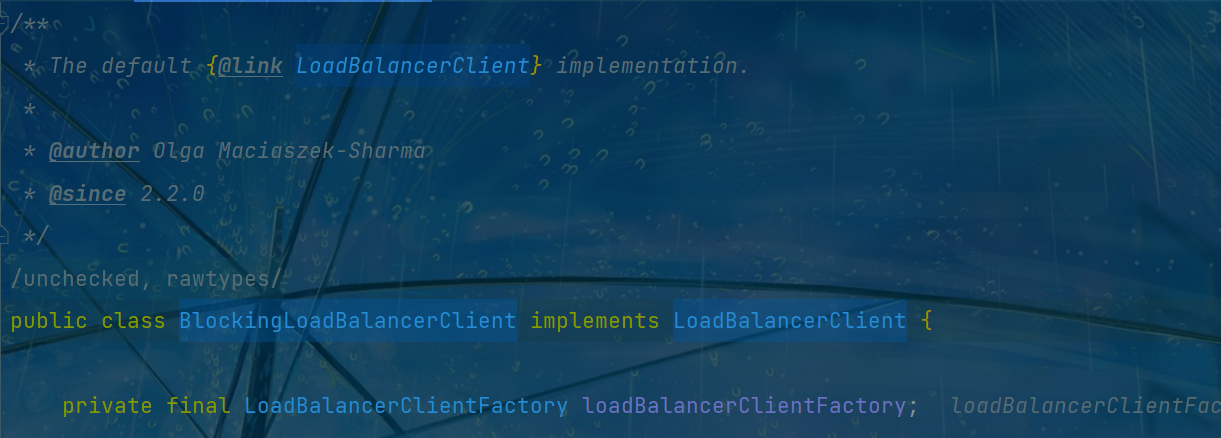 /** * The default {@link LoadBalancerClient} implementation. * * @author Olga Maciaszek-Sharma * @since 2.2.0 */ @SuppressWarnings({ "unchecked", "rawtypes" }) public class BlockingLoadBalancerClient implements LoadBalancerClient { ... ... ... }了解了 loadBalancer 是什么, 继续往方法下面走