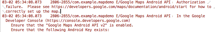 <YOURSHA1KEY>;com.example.mapdemo? The error messages should include the Key and package namespace you should be using. -