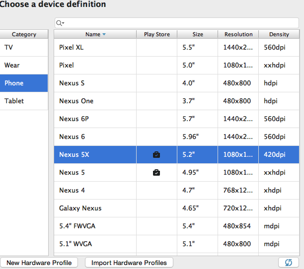 Select Nexus 5X ⇒ Show downloadable system images and select Oreo, API Level 27, x86_64, Android 8.1 (Google Play)
