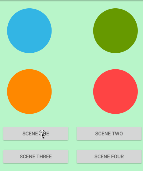 Scene scene2 = Scene.getSceneForLayout(sceneRoot, R.layout.activity_animations_scene2, this);On some type of event, we then can use the Transition Manager to navigate to the next scene: