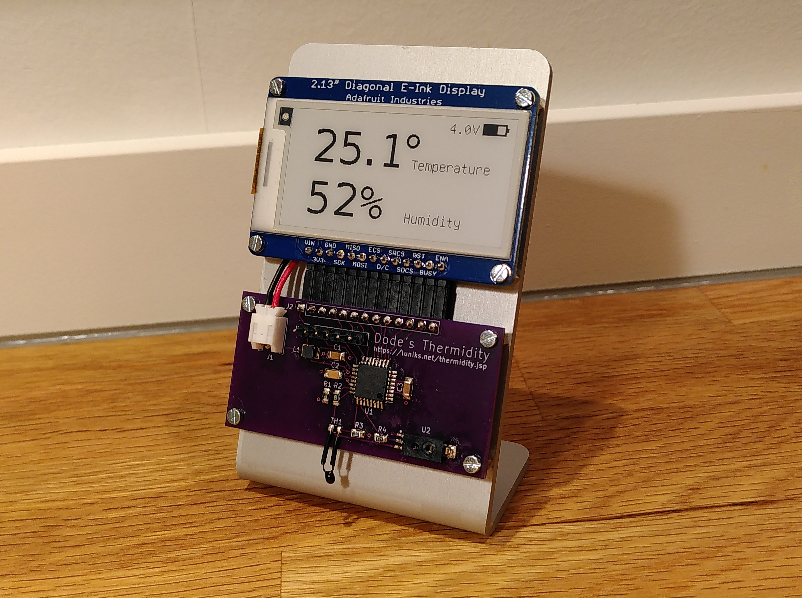 AVR MCU based battery powered thermometer and hygrometer with e-ink display.