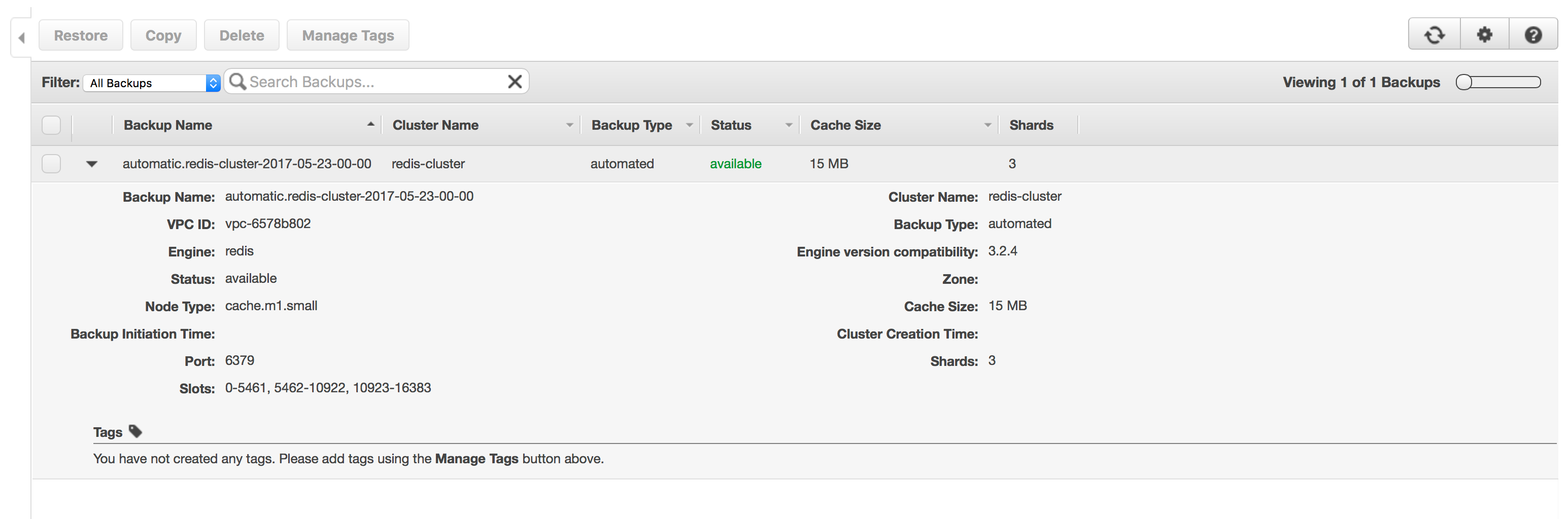 In this example snapshots have been enabled with a 5 day retention period, the AWS ElastiCache consul shows a list of these backups.