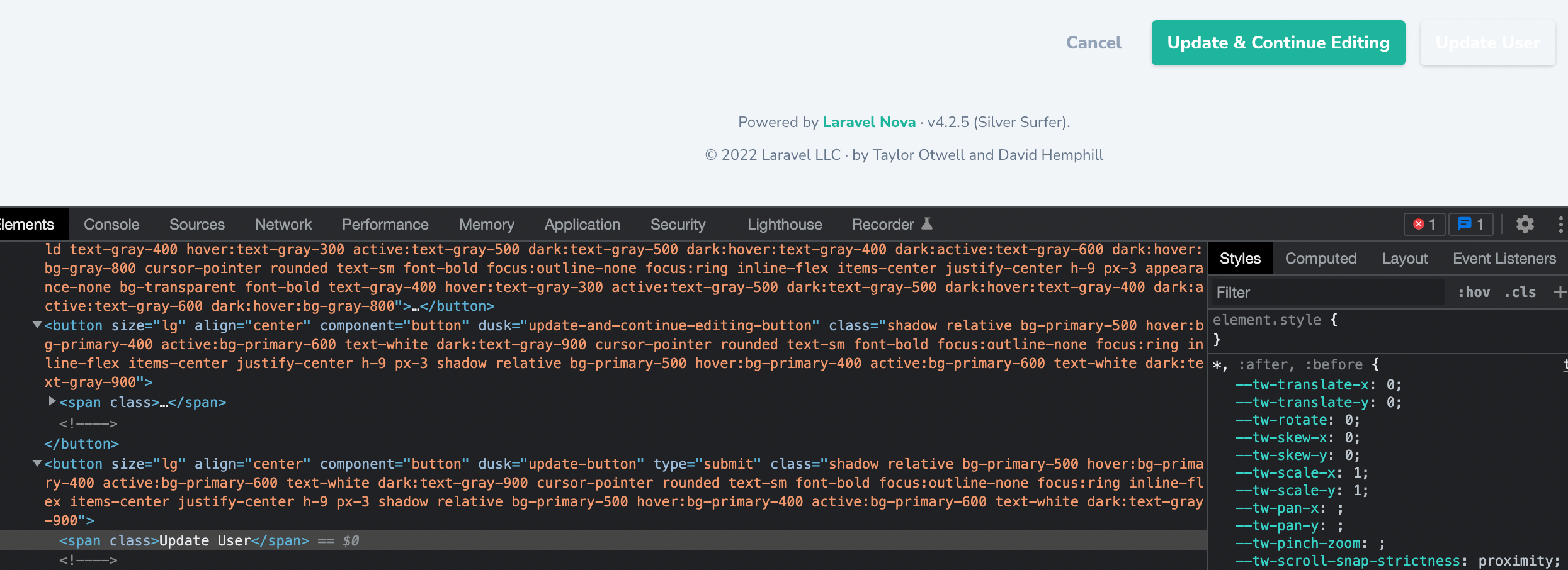 Just upgrade to v4, can't find why some of the form button colors looks like this without bg color: The tailwind classes are the same as the "Update & Continue editing" button. My brand colors in nova config file: On create forms: Suggestions? |