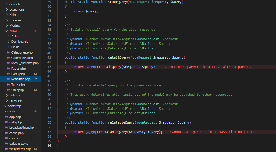 Description:on vscode maybe cause php intelephense they say cannot use parent in class with no parent inside Detailed steps to reproduce the issue on a fresh Nova installation: |
