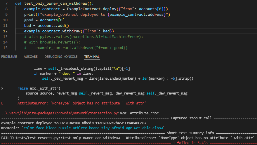 Edit: Repository with source code can be found here: https://github.com/n4n0b1t3/brownie.reverts.example In the process of getting to the bottom of the error when using I am getting a very different result: I believe this is caused by Can you try this in your environment? Are you getting the same result or does your message look like the one from the video? More info and the complete setup and test code can be found here: |