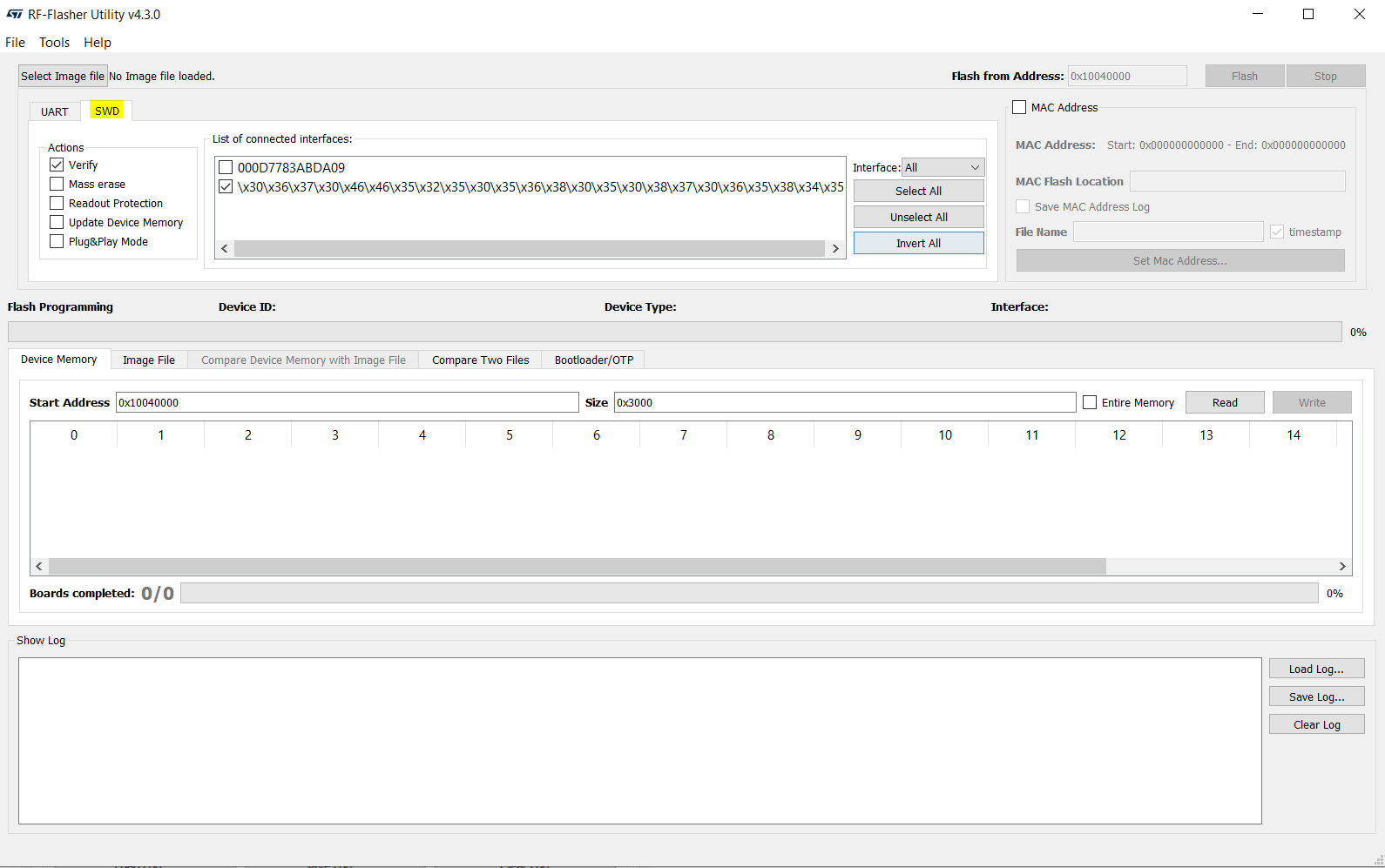 First of all, install the ST BlueNRG-1_2 Flasher Utility and open it, then select the SWD tab: