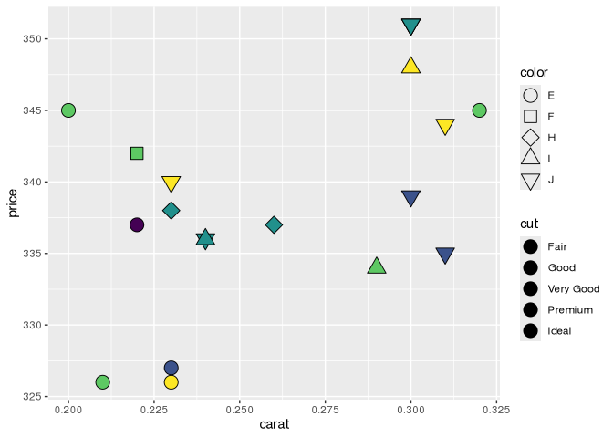 scale_shape_manual(values = 21:25)It can of course be fixed by overriding the shape to be 21 as in the first example: