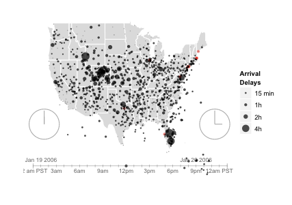 Flights are shown as dots on the map with increasing point sizes for increasing amounts of delays. To get a more robust rendering, delays of more than 4 hours are right censored (i.e. clipped to 4 h). Two additional viewports are used for displaying the clock faces.