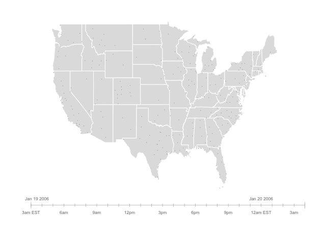 Map of the USA. The time slider underneath the map is set to one day – in this case January 19th, 2006. Airports with a volume of at least 100 annual flights are rendered as (very) faint grey dots.