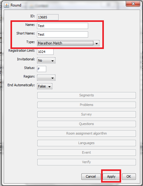 NameandShort Namefields. Change theTypetoMarathon Matchand clickApply. -